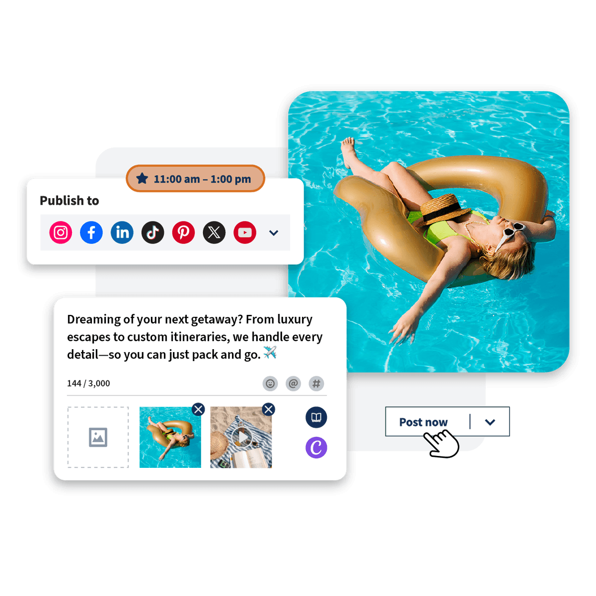 Social media scheduling interface showing vacation post with woman relaxing on gold pool float, alongside publishing options and timing controls